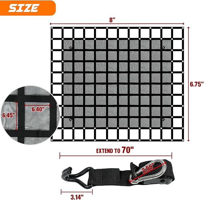 - Adjustable S-Hook Straps: The cargo net includes four durable tie-down straps with adjustable lengths up to 70 inches, featuring rubber-coated S-hooks to prevent scratching your vehicle