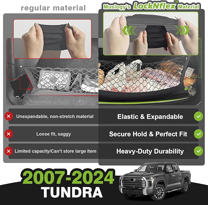 - Perfect Fitment: Muslogy Truck Cargo Net is designed to be compatible with Toyota Tundra 2007-2025. Fits your Toyota Tundra truck bed perfectly.