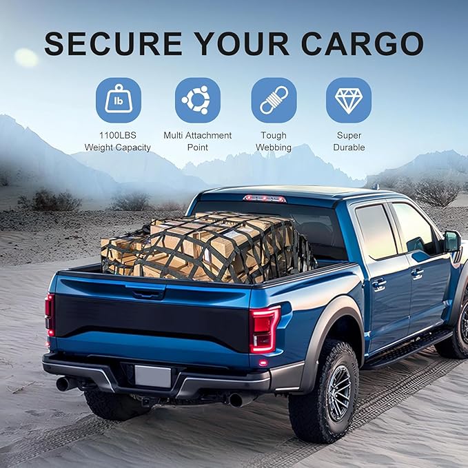 - Oversized 82" x 50" Universal Fit:Designed for full-size pickup truck beds,trailers,and SUVs,this heavy-duty cargo net stretches to 82 inches long x 50 inches wide,providing maximum coverage to secure bulky gear,tools,or luggage.No more worrying about shifting loads.