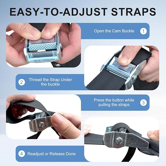 - Multifunctional hook:Features rust-proof S-hooks and quick-adjust cam buckles for a custom,snug fit on any truck or trailer. Easily tighten or loosen straps in seconds-no tools needed.The heavy-duty metal hardware wonβt bend or break under stress.
