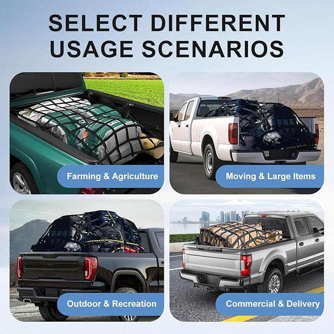 - Versatile & Multi-Purpose Use:Beyond pickup trucks,this cargo net works for SUVs,trailers,ATVs,and boats.Great for construction sites, road trips,moving days,or off-road adventures.A must-have for contractors, campers, and DIYers.